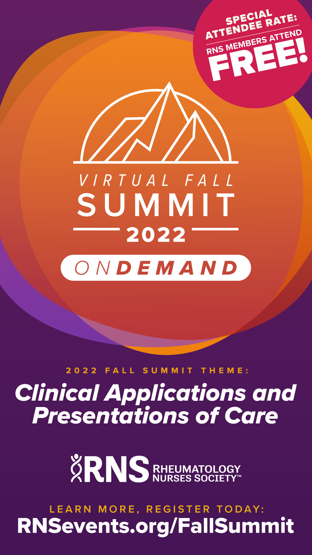 Join us for the 2022 Rheumatology Nurses Society (RNS) Virtual Fall Summit where top educators in their fields will explore the clinical faces of rheumatic diseases including lupus, gout, spondyloarthropathies, and more. This accredited, evidence-based educational summit will also examine topics ranging from biosimilars, immunology, and functional medicine, to patient mental health and navigating telemedicine. You will experience interactive learning sessions, fun games and prizes, and engage with fellow healthcare providers throughout our event.